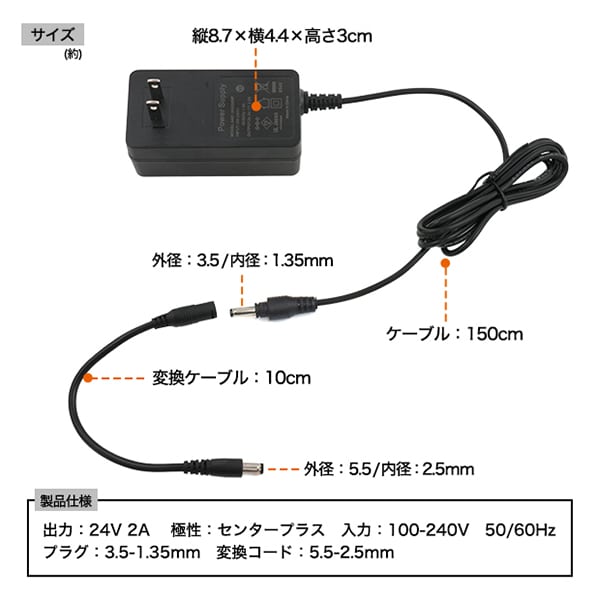 プラタ 24V2A 汎用スイッチングACアダプター 5.5-2.5変換ケーブル付属 ac24v2a55-25 1個(ご注文単位1個)【直送品】