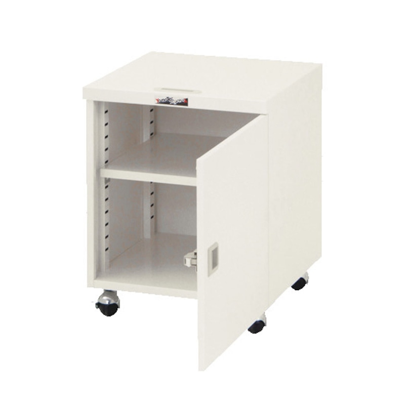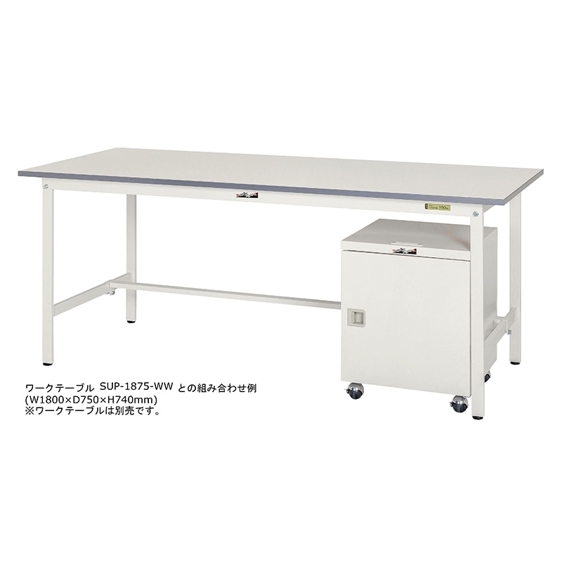 補助テーブルや脇机として使えるキャビネットワゴン。山金工業製ワークテーブル150シリーズにマッチするシルキーホワイト色です。片開きの扉付きタイプです。付属の自在棚は30mmピッチで高さ変更が可能です。※扉に鍵は付属しておりません。●全体均等耐荷重:自重含む80kg●本体内寸:W403×D424×H430mm●自在棚1枚付●棚板耐荷重:30kg●キャスター:50φゴムキャスター(自在ストッパー付2個、自在2個)●色:シルキーホワイト●質量:15.9kg●完成品●メーカー品番:UCW-D