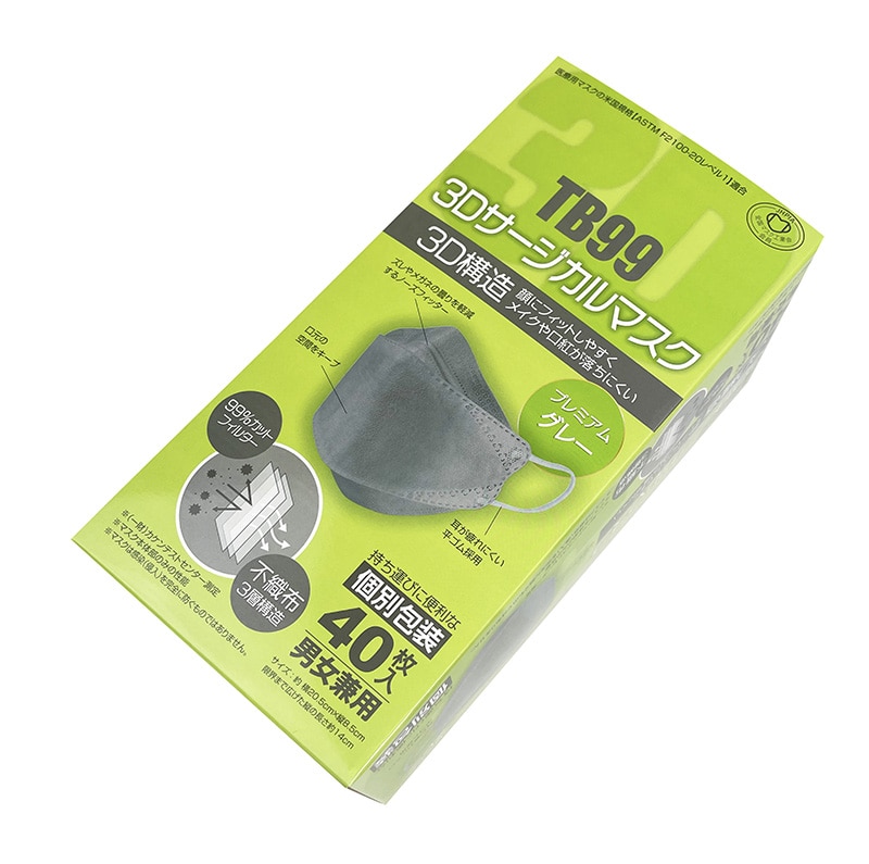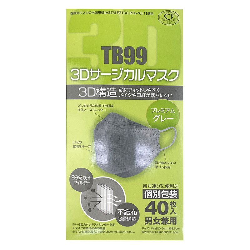 つばさ 3Dサージカルマスク 個包装 40枚 TB99 プレミアムグレー 1箱(ご注文単位40箱)【直送品】