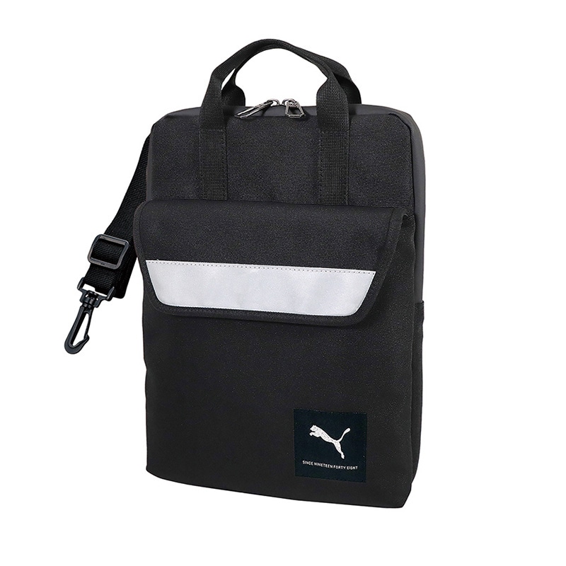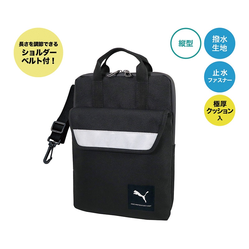 プーマのロゴ入り肩掛け対応子ども用タブレット・ノートPCケースです。撥水加工を施した表生地と止水ファスナーを使用し、雨の日などでも水から収納物を守り、中芯には極厚クッション材、メインの収納部分には起毛生地を使用し、衝撃から収納物を守ります、ランドセルに入るコンパクト設計になっています。充電アダプタやコードが入れられる前ポケットと肩掛けショルダー付です。タブレット、ノートPCにカバーをつけた状態でのご使用は、必ず事前にサイズや使用感をご確認ください。●縦型