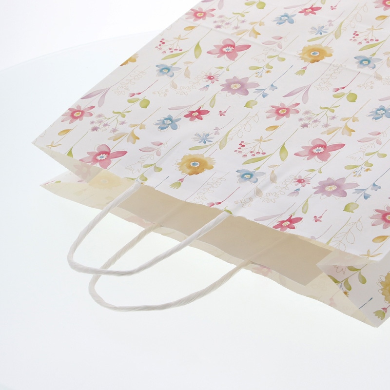 水彩画調の花々を、縦に配したデザインの手提げ紙袋です。幅と高さがほぼ正方形のオールマイティモデル。●手紐:丸紐白●入数:50枚