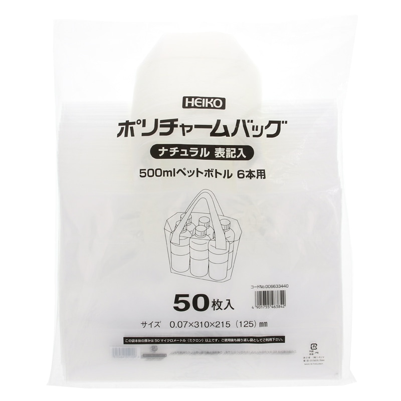 HEIKO 手提げポリ袋 ポリチャームバッグ 500mlペットボトル 6本用 ナチュラル 表記入り 50枚/袋