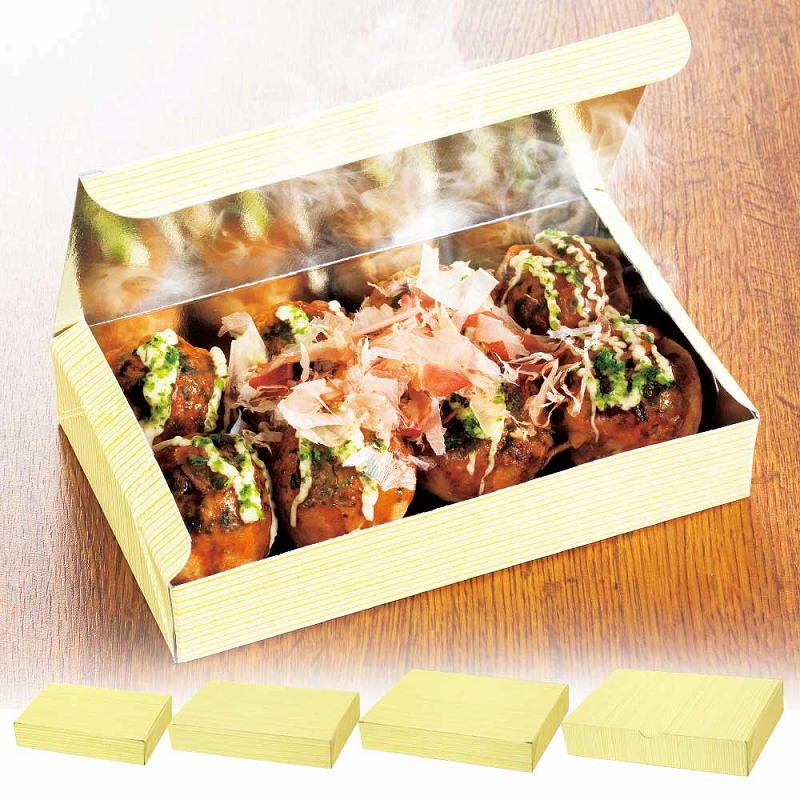 メタリック紙使用で保温効果が有り、赤飯やたこ焼き、お好み焼きなどの持ち帰りに最適です。