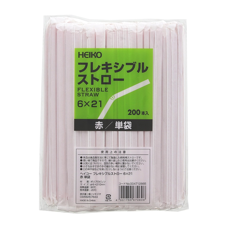 HEIKO フレキシブルストロー 6×21 単袋 赤 200本/袋