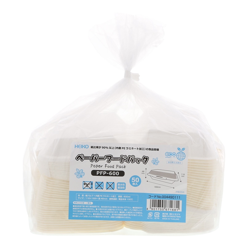 プラスチックの代替え用に生まれた紙製で環境に優しい食品容器です。テイクアウトや行楽、アウトドアなどで大活躍します。内側PEコーティング加工で耐水性、耐油性があります。電子レンジ・オーブンではご使用出来ません。食品衛生法規格基準適合商品です。●電子レンジ・オーブン使用不可●内容量:600ml●入数:50枚