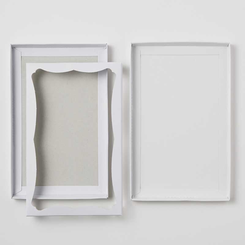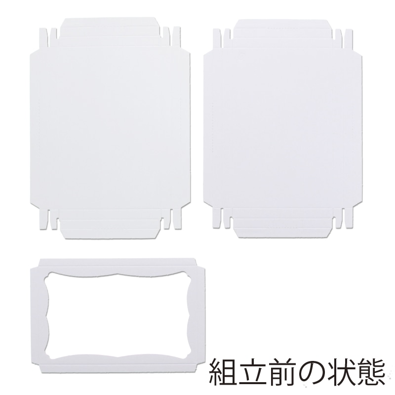 身・フタ・中枠の3種のパーツから組み立てる、フタをかぶせるタイプの白無地ボックスです。四方のサイドを折り込んで仕上げる組み立て式です。フタは表面に光沢を持たせており高級感があります。中枠付ですが、透明フィルムは貼ってありません。ハンカチ×2枚などに。10枚入り。