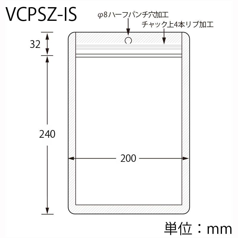 チャック上32+チャック下340×袋巾240mm/吊り下げ穴8mm