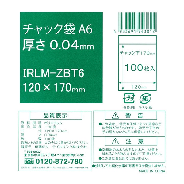 伊藤忠リーテイルリンク ポリ袋 チャック袋 A6 0.04mm 100枚入 IRLM-ZBT6 1パック(ご注文単位60パック)【直送品】
