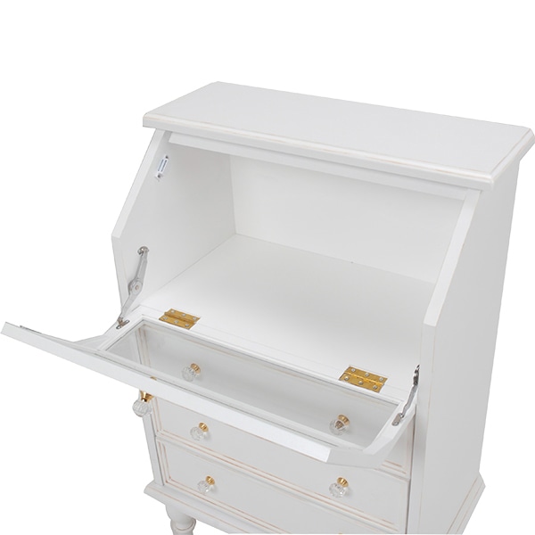 - キラキラ取っ手で可愛さ倍増。引き出しの上はガラス張りのフラップ扉なので、お洒落に見せる収納ができるアンティーク風キャビネット。脚のコロンとした形、塗装など、 アンティーク風に仕上げました。●引出し下内寸:幅49×奥行26×深さ10cm●脚部・取っ手のみ取付