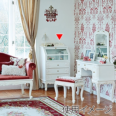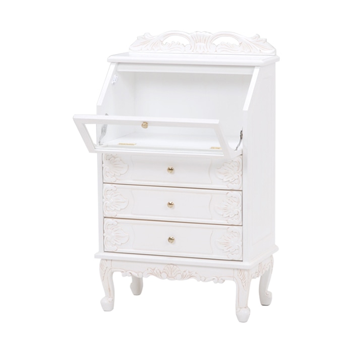 - エレガントな彫刻とねこ脚、引き出しの上はガラス張りで見せる収納ができるアンティーク風ガラスキャビネット。