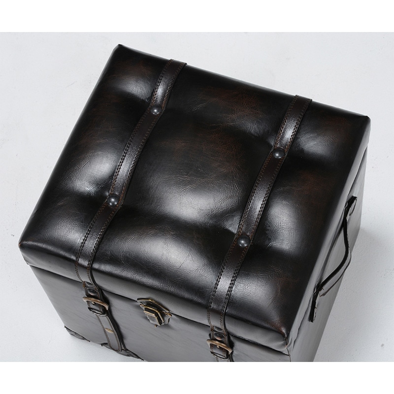 - センスと遊び心あるトランク型収納スツール。重厚感あふれる合皮レザー張りと使い込んだような金具がヴィンテージな雰囲気を盛り上げます。・フタは座れる仕様なので、オシャレなスツールとしても活躍。側面、裏にもしっかりレザー張りされています。引出しの中も布張りしているので衣類等の収納もOK。●収納部内寸:約幅38×奥行33×深さ29cm●完成品