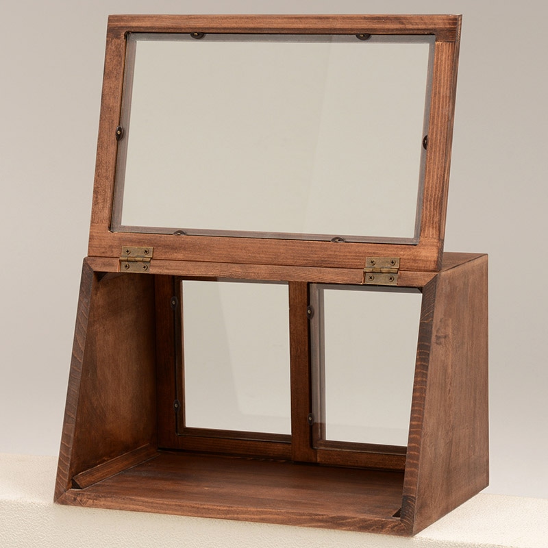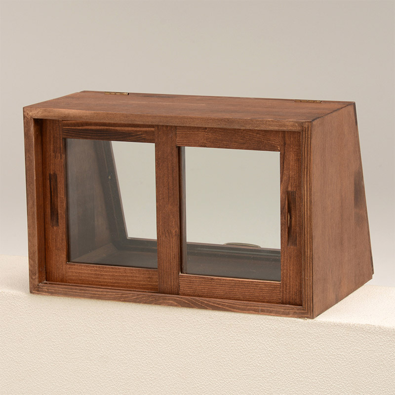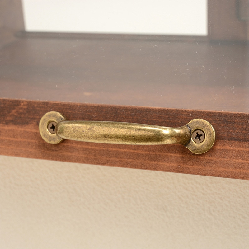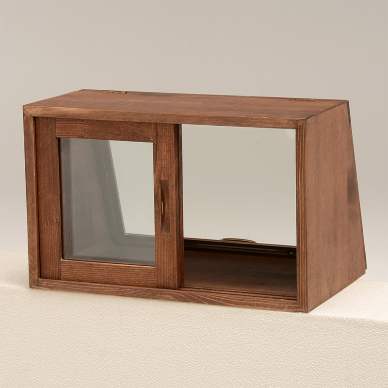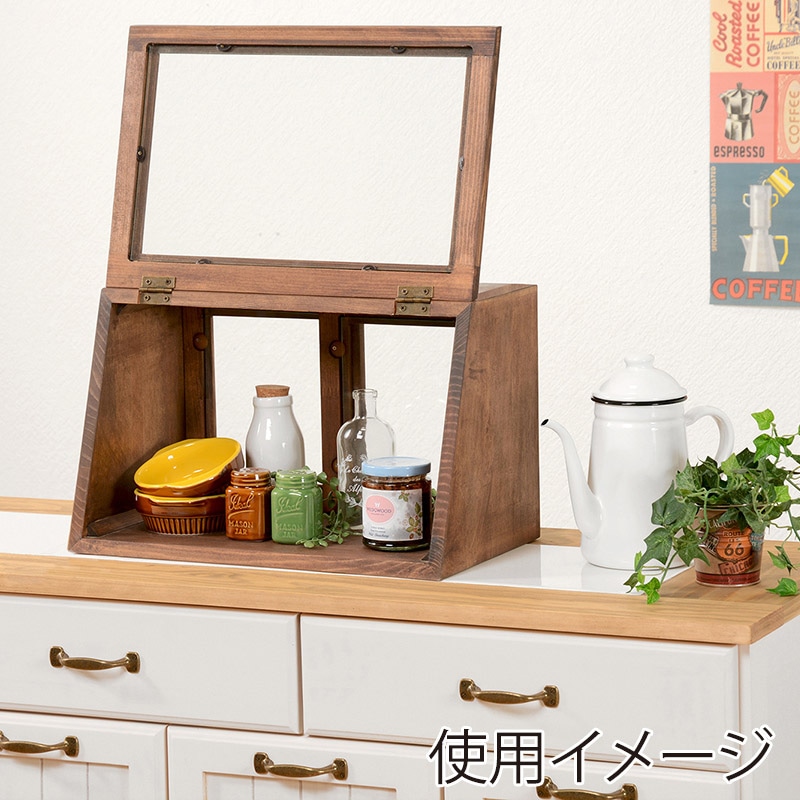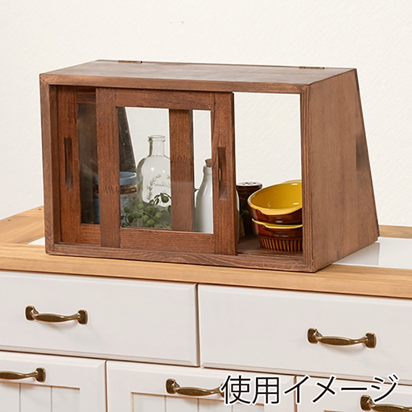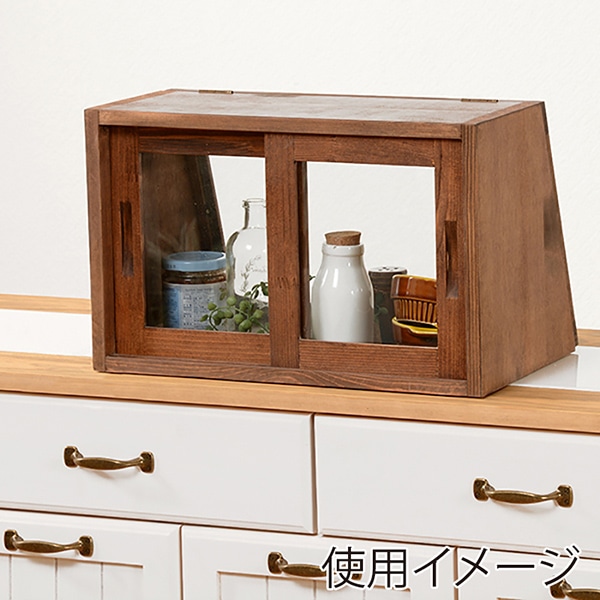 - 木の風合いが味わい深いカウンター上ガラスケース。表と裏で違う表情を見せる形状でディスプレイとしても活躍します。ガラス戸なので光を通し、空間を明るく爽やかに演出してくれます。扉は前面がフラップ扉、背面は引き戸になっているので、どちらからでも取り出せます。※取っ手と背面の扉のみ取付けが必要。※プラスドライバーをご用意下さい。
