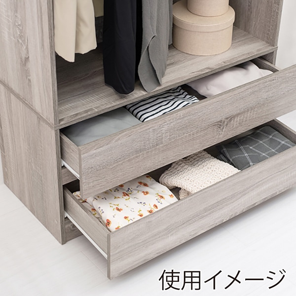 - クローゼットのようなしっかりした形のハンガーラック。引出しが付いているので隠す収納も、サッとかけるだけの収納も両方を兼ね備えたワードローブです。高さは3段階に調節できるので、子供でも大人でも使いやすい。●組立式