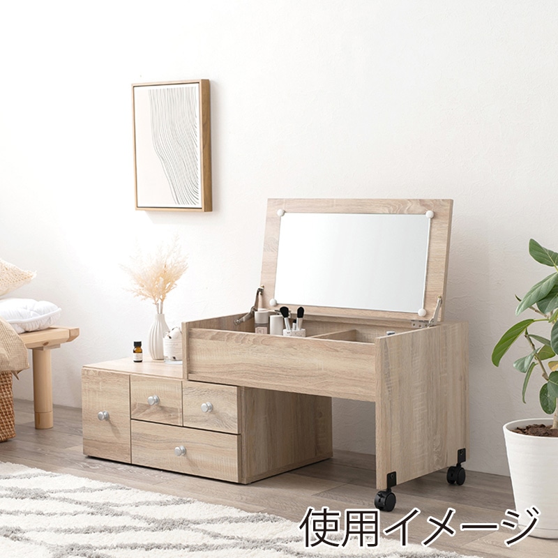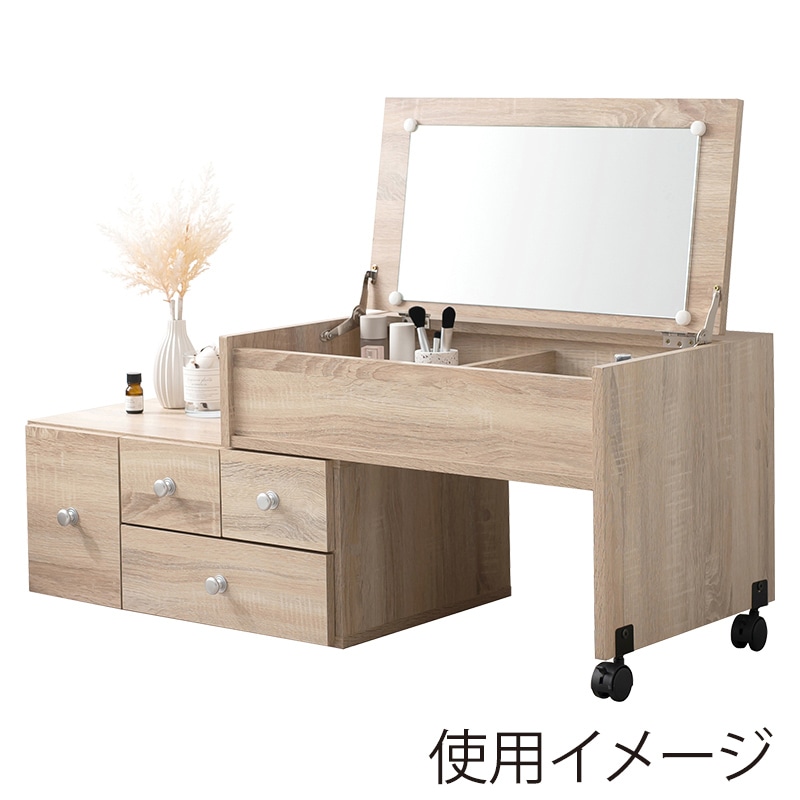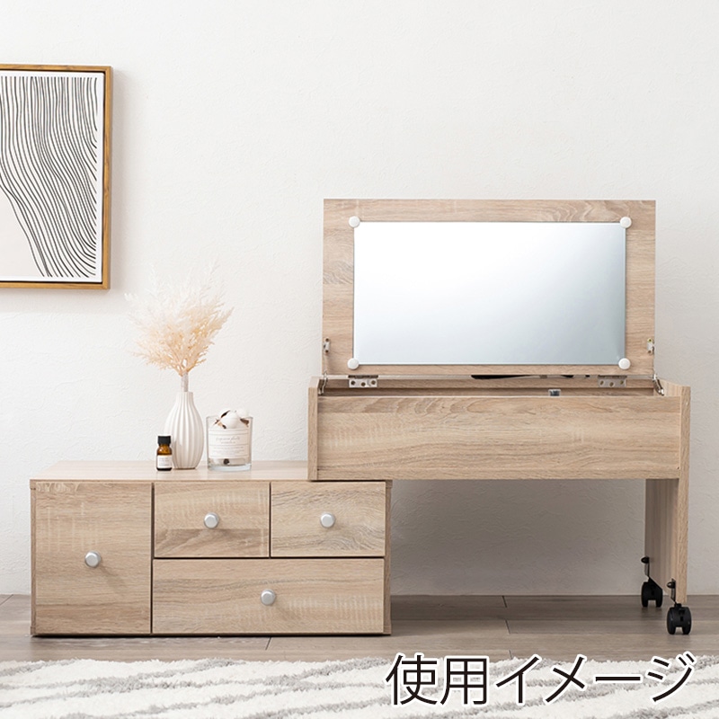 - 横にスライドするだけで横幅自由自在、伸縮式ドレッサーです。63~110cmまで自在に調整が可能。メイク道具や小物などたっぷり収納でき、コンセント付きなのでヘアアイロンも使用可能。天板の一面にワイドで見やすい鏡付き。ドレッサーとして使わないときは鏡を閉じて、サイドテーブルやデスクとしてもお使いいただけます。●2口コンセント付●伸縮式●組立式