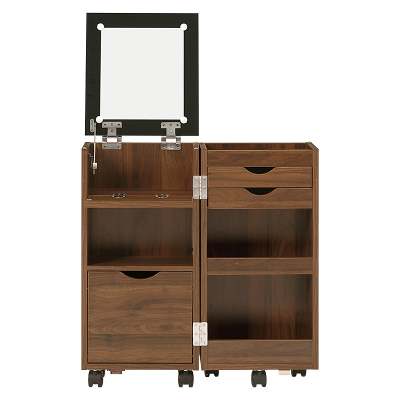 - コスメからヘアメイク道具、アクセサリーまで、身支度に必要なものが全て収まる大容量コスメワゴン。鏡の角度は無段階調節が可能。身長や座る場所の高さに合わせて調節できます。天板を閉じれば、普段はサイドテーブルとしても使えます。組み立ては本体にキャスターとマグネットを付けるだけ。※プラスドライバーをご用意ください。●キャスター付●組立式(キャスターとマグネットのみお客様取り付け)