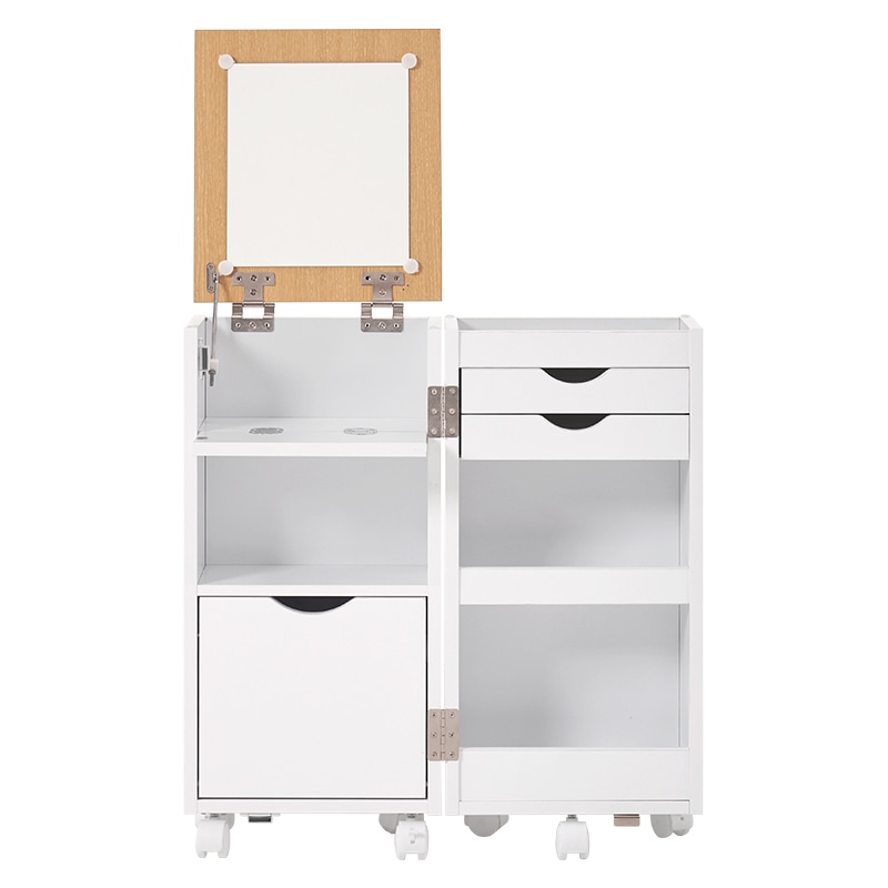 - コスメからヘアメイク道具、アクセサリーまで、身支度に必要なものが全て収まる大容量コスメワゴン。鏡の角度は無段階調節が可能。身長や座る場所の高さに合わせて調節できます。天板を閉じれば、普段はサイドテーブルとしても使えます。組み立ては本体にキャスターとマグネットを付けるだけ。※プラスドライバーをご用意ください。●キャスター付●組立式(キャスターとマグネットのみお客様取り付け)