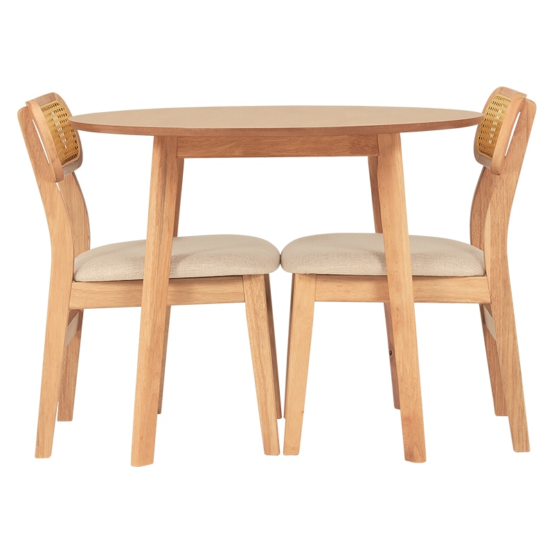 - 丸テーブルと、ラタン調背もたれのチェア×2脚のダイニング3点セットです。コンパクトで場所を取らず置きやすいサイズ感です。※ハンマーをご用意ください。●チェア:約幅46.5×奥行54.5×高さ76cm/座面高:42cm●天板材質:天然木化粧繊維板●組立式