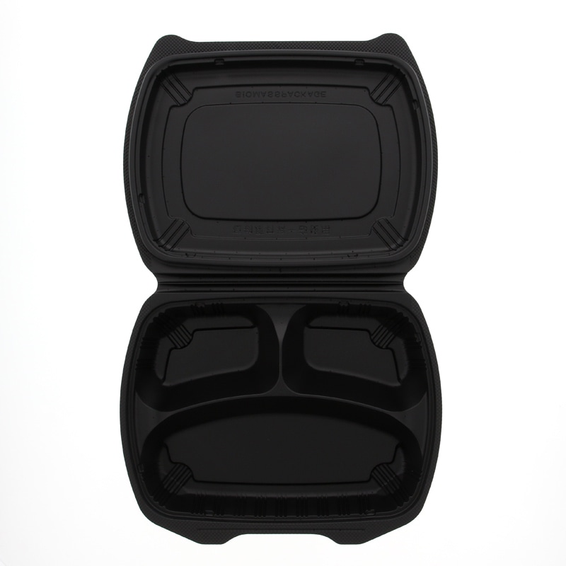 テイクアウト専用の本体・蓋一体型の容器です。植物素材を一部配合した環境対応商品です。●仕切りの数:3●電子レンジ使用可●オーブン使用不可●耐油性あり●耐熱温度:130℃●ご飯容量:200g●入数:25枚
