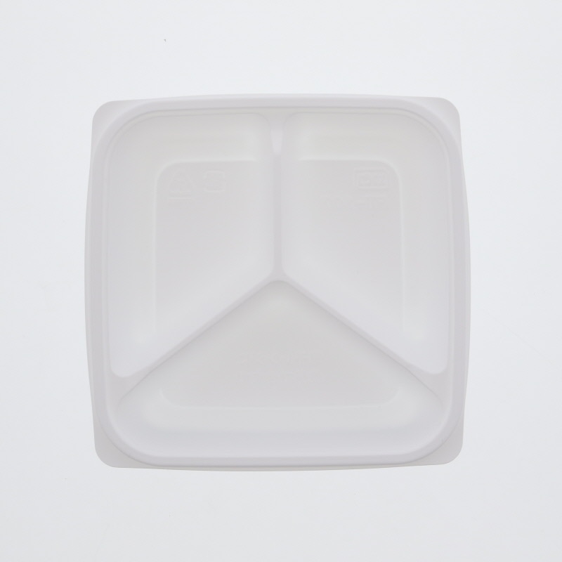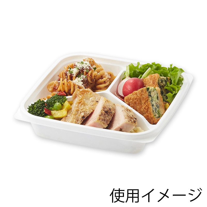 三仕切りの惣菜容器です。内嵌合のため汁物にも対応しております。蓋は別売です。●電子レンジ可●オーブン使用不可●耐油性:あり●耐熱温度:130℃●入数:50枚