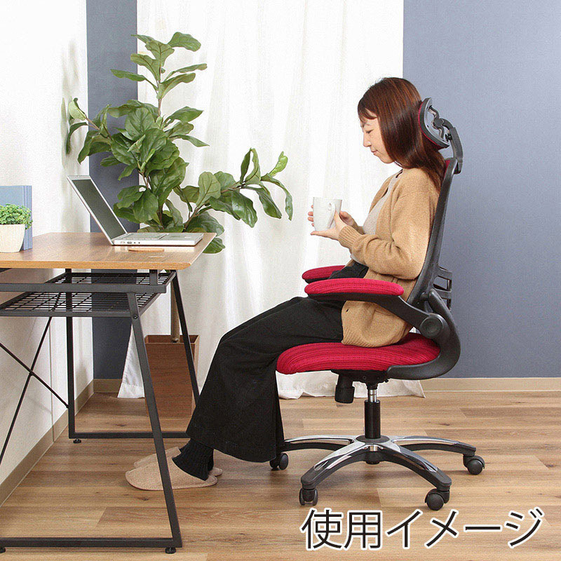 - 頭の重さを支え、首や肩への負担を軽減させてくれるヘッドレスト付き。高さも調節できます。デスク下にスッキリ収納できる可動式の肘置きです。シートハイ45~55cmの昇降機能付き。レバーの簡単な操作で高さを調整できます。座面は角度90~106度でロッキング。体の負担を軽減させ、長時間座っても快適です。クロムメッキでスタイリッシュな脚は、ちょっとした移動に便利なキャスター付き。長時間座っても蒸れにくい、通気性に優れたメッシュ素材を採用。●クッション材:ウレタンフォーム●重量:16kg●お客様組立品