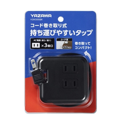 ヤザワコーポレーション 巻取りモバイルタップ 3個口 0.6m 黒 H2M3006BK 1個(ご注文単位1個)【直送品】