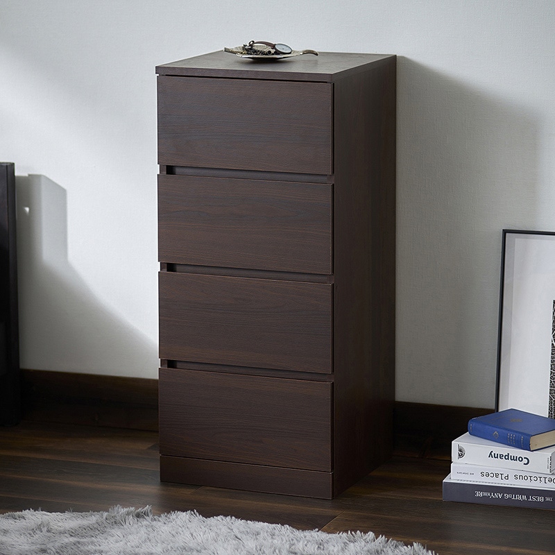 シンプルなデザインの木製チェストです。引き出しは4段です。置く場所を選ばない幅約40cmのスリムタイプです。引き出しには開閉がスムーズな金属レールを使用しています。引き出しの裏面には底抜け防止の補強板を付けることで、しっかり支えることができます。背板には横揺れを防止する背板止め付きです。お客様組み立てとなります。組み立てパーツに番号シール付きです。●耐荷重:全体約22kg、天板10kg、引き出し1個あたり3kg●引き出し内寸:約307×336×115mm●引き出し1段あたり収納目安:Yシャツなら4枚・バスタオルなら4枚・タオルなら5枚