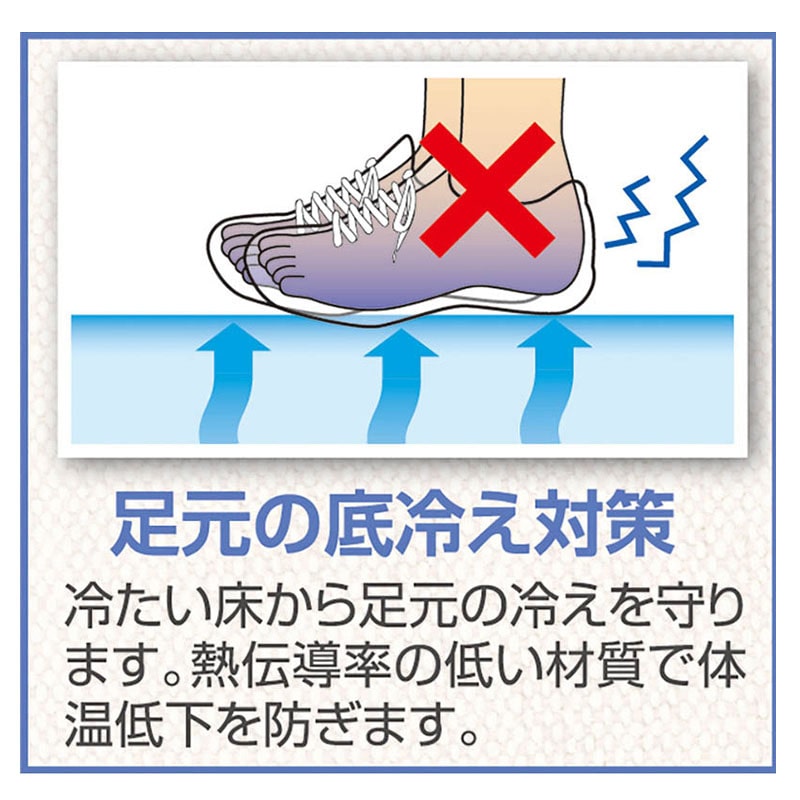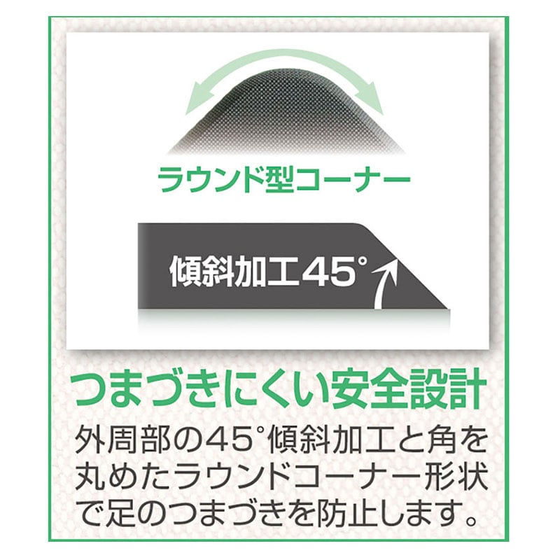 立ち仕事からくる足腰の負担を軽減し、疲れにくくするマットです。非常にやわらかなクッション性が体重負担を分散し、足腰の疲労感を軽減します。耐水、耐油性に優れたマットなので、水がしみこみにくく、水洗いをしても直ぐに乾きます。ものづくり現場で長年愛されているマットなので、耐久性に優れ、長い間ご利用いただけます。外周部の45度傾斜と、角を丸めたラウンドコーナー形状で足のつまづきを防止します。冷たい床から足元の冷えを守ります。熱伝導率の低い材質で、体温低下を防ぎます。●質量:500g