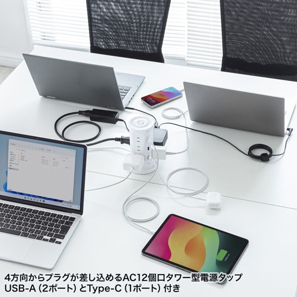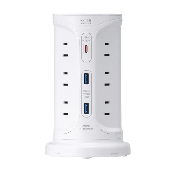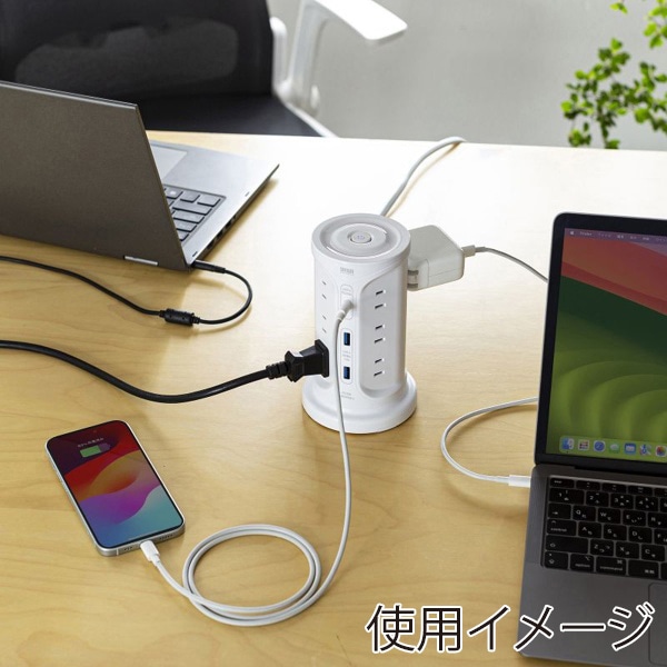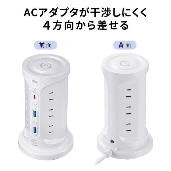 サンワサプライ タワー型電源タップ USB充電機能付き ホワイト TAP-B112C1A2W 1個(ご注文単位1個)【直送品】