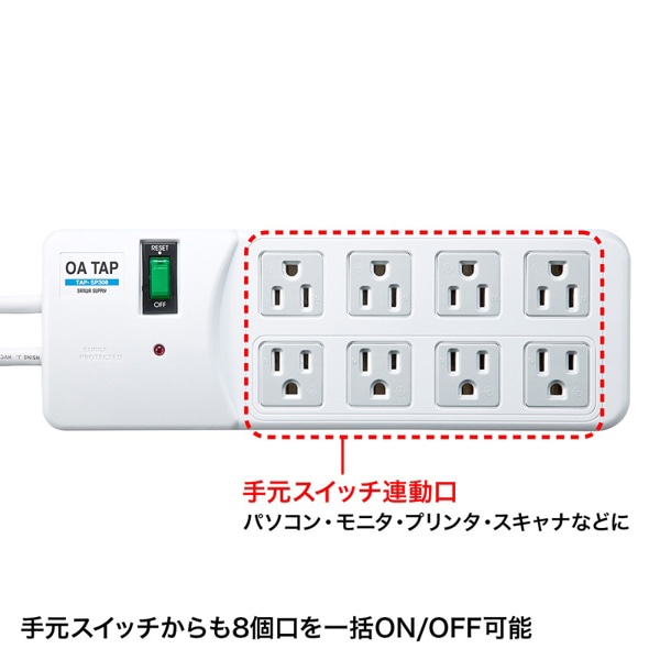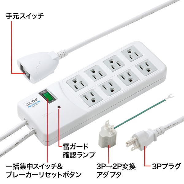 サンワサプライ 雷ガードタップ 一括集中スイッチ付き 3P・8個口・2.5m TAP-SP308 1個(ご注文単位1個)【直送品】
