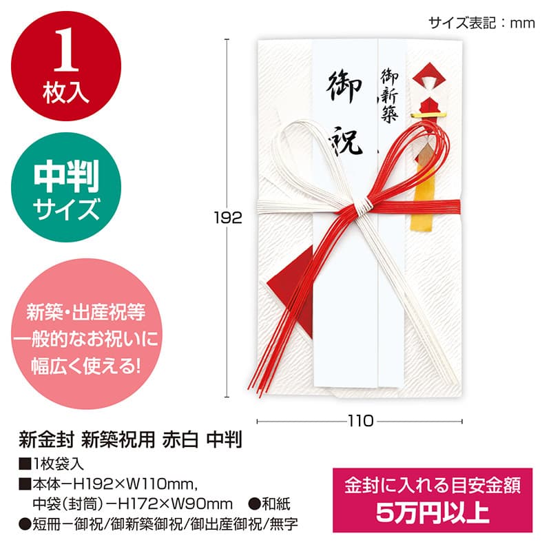 ササガワ 新金封 新築祝用 中判 赤白 27-5753 1枚(ご注文単位5枚)【直送品】