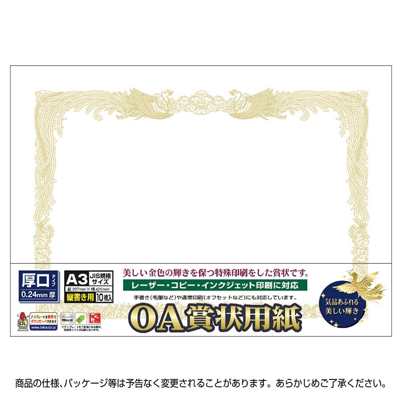 ササガワ 厚口OA賞状用紙 白 A3判 縦書用 10-1280 10枚 1冊(ご注文単位10冊)【直送品】
