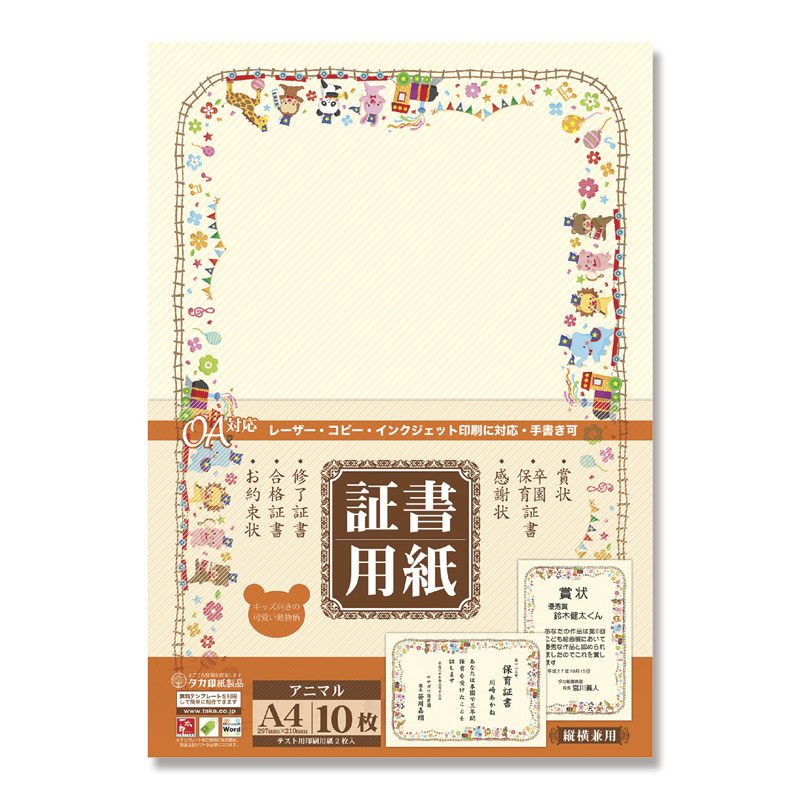 ササガワ 賞状・証書用紙 A4サイズ 1冊10枚袋入 10-1700 アニマル 1冊(ご注文単位5冊)【直送品】