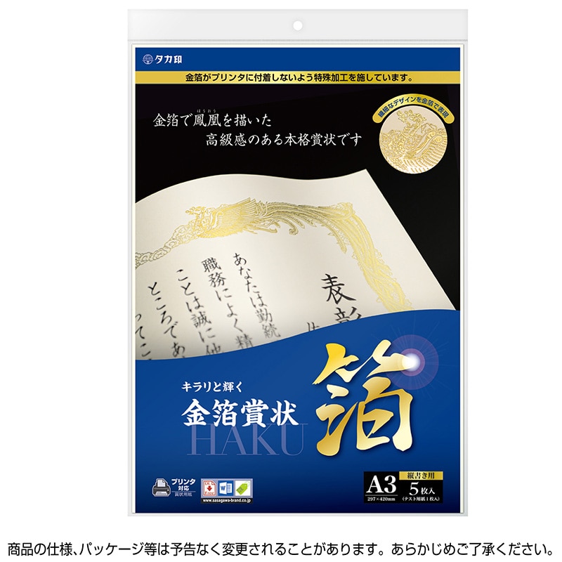 ササガワ 金箔賞状用紙 A3判 縦書用 白 10-3080 5枚 1冊(ご注文単位5冊)【直送品】