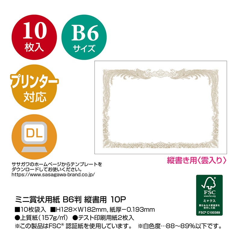 ササガワ ミニ賞状用紙 縦書用 B6判 10-1540 10枚 1冊(ご注文単位5冊)【直送品】