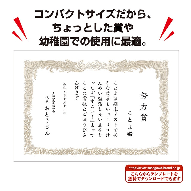ササガワ ミニ賞状用紙 縦書用 A5判 10-1650 100枚 1箱(ご注文単位1箱)【直送品】