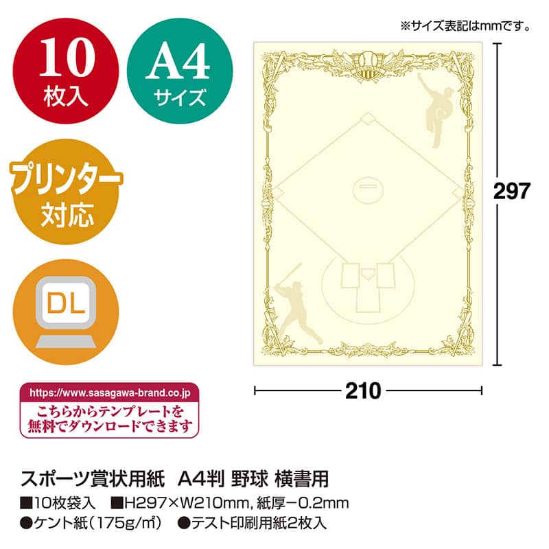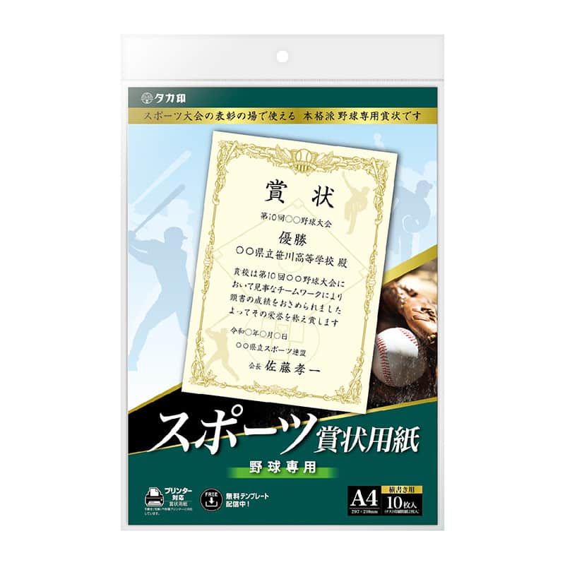 ササガワ スポーツ賞状用紙 プリンター対応 A4判 野球 横書用 10-1802 1冊(ご注文単位5冊)【直送品】