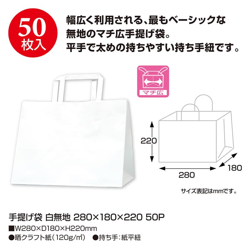 ササガワ 手提げ袋 白無地 280×180×220mm 50枚入 50-5720 1包(ご注文単位1包)【直送品】