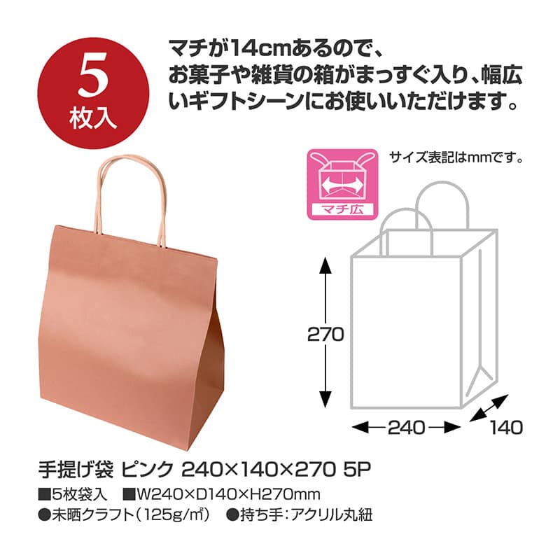 ササガワ 手提げ袋 ピンク 240×140×270mm 5枚入 50-6041 1外袋/袋(ご注文単位1袋)【直送品】