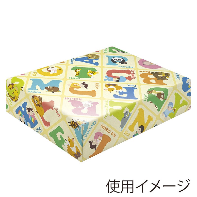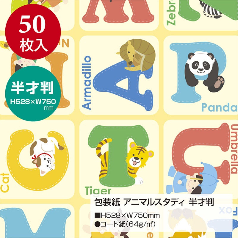 包装紙アニマルスタディ半才判です。サイズは縦528mm×横750mmで、表面に光沢のあるコート紙を使用しています。動物などの名前を英語で表記した、楽しく学べるポップなアニマル柄のデザインは、幼稚園や小学生の入学進学のお祝いギフトなど様々なシーンでお使いいただけます。ササガワホームページ内の「レッツラッピング」サイトではおしゃれなリボンやシールなどと組み合わせたオリジナルのラッピングの包み方などを掲載しております。包装に必要な大きさを調べる「包装紙の大きさチェッカー」もあります。1包50枚入りの三つ折り仕立てです。