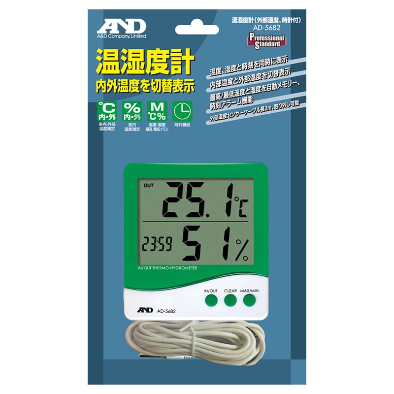 エー・アンド・デイ 外部センサー付温湿度計(時計付き) AD5682 1台(ご注文単位10台)【直送品】