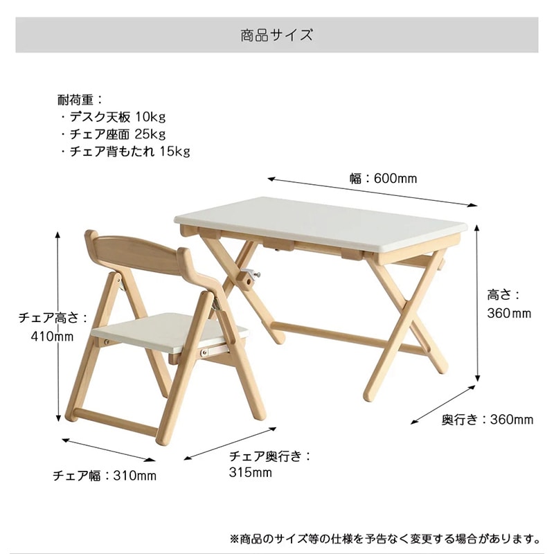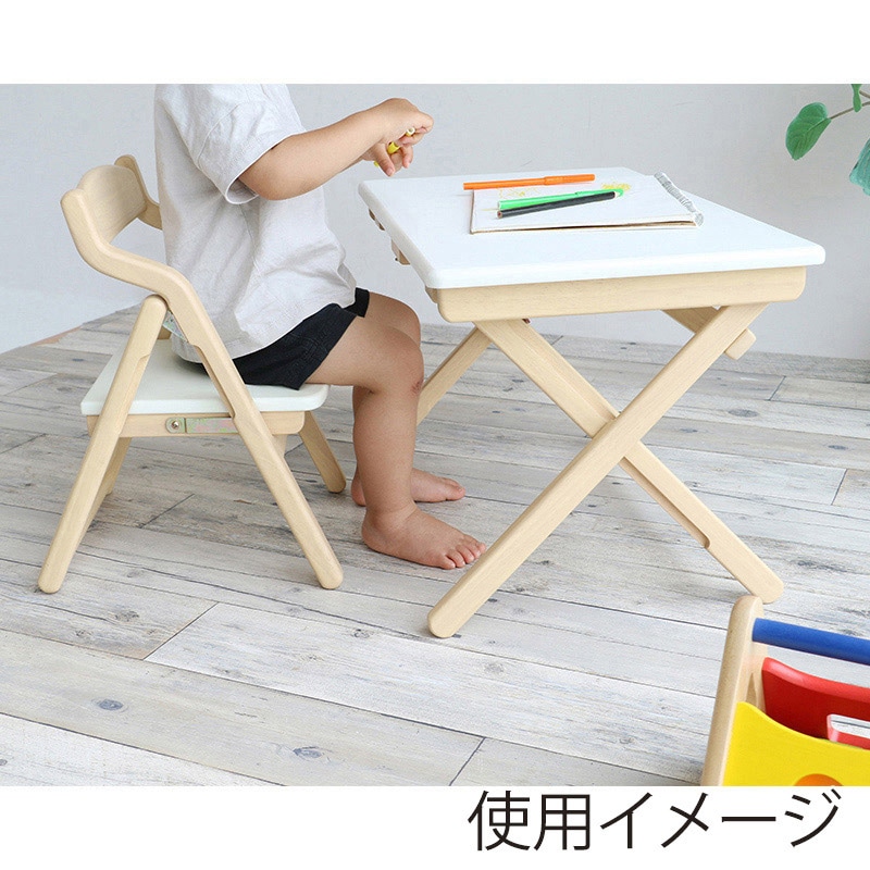 - 収納に便利な折りたたみ機能がついたデスクチェアセット。家具のスキマや空いたスペースに収納することも可能です。脚部にロック機能付き。誤って閉じてしまわないようデスクチェア共にロック金具が付いています。天板や脚部の角は丸みをもたせています。小さなお子さまも安心してご使用いただけます。脚の部分に「ざぐり」という加工を行っています。折りたたみ時に指を挟みにくく、丸みを帯びた形をしているのも特徴です。天板にはメラミン化粧板を使用。水や傷に強く耐久性もあり日々のお手入れも簡単です。※木製品のため商品の色味・木目は若干異なります。●チェアサイズ:幅310mm×奥行315mm×高さ410mm●座面高さ:200mm●完成品●耐荷重:天板10kg/チェア座面25kg●対象年齢:2~4歳頃●重量:デスク約3.6kg/チェア約1.9kg