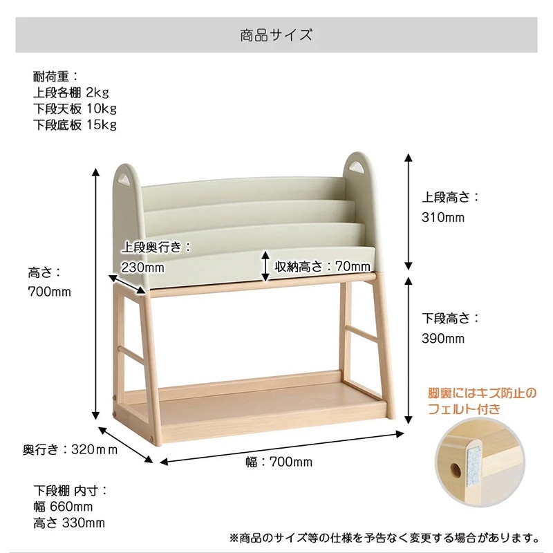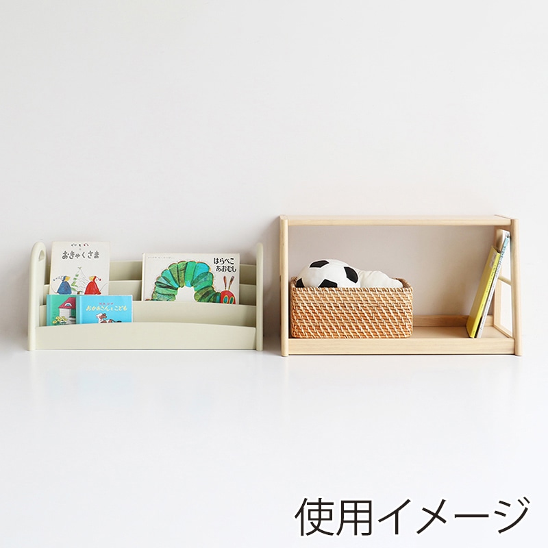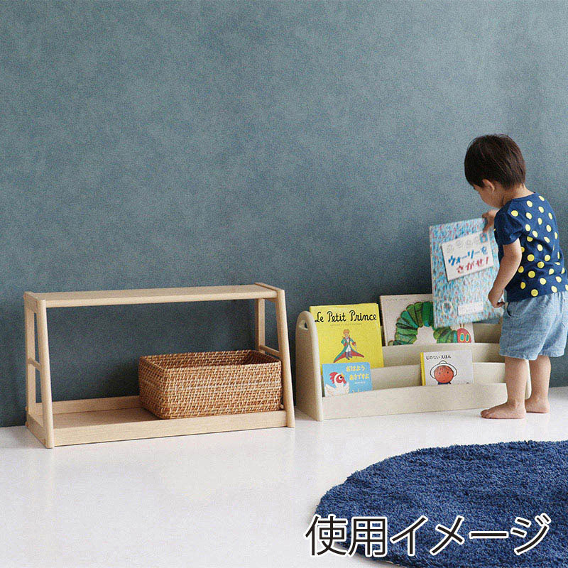 - 成長に合わせてアレンジできる絵本ラックです。上段と下段を分けたり連結したりできる嬉しい設計。お子さまの成長に合わせてアレンジしてお使いいただけます。上段は絵本の表紙が見えるので、必然と絵を見る時間が増えます。お子さまがケガをしないように全ての角を丸くしています。素材はあたたかみのある天然木を使用。プリント化粧繊維板では出せない木のぬくもりを感じられます。上段の側面には持ち手用の穴が開いており、連結や分離するときも作業がしやすいカタチに。持ち運びも楽々です。※上下は必ずボルトで連結して使用してください。※木製品のため商品の色味・木目は若干異なります。●組立品●耐荷重:上段棚各2kg/下段天板10kg/下段底板15kg●重量:約9.6kg