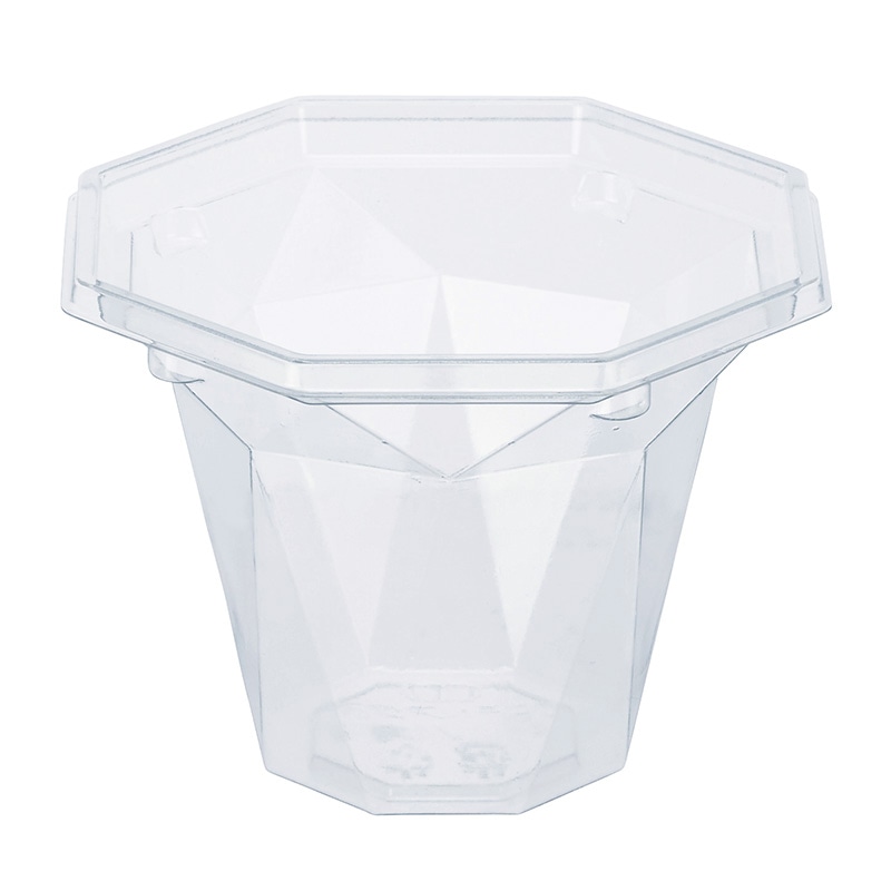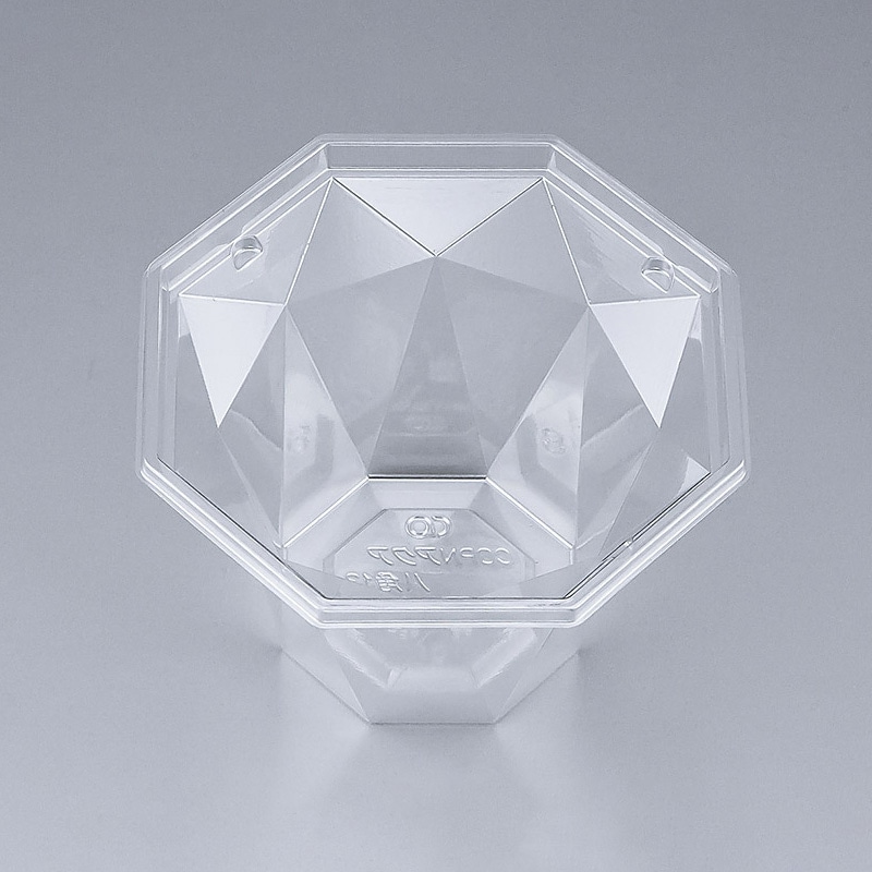 彩りを最大限に引き立て、鮮度をキープ。食材の「美味しさ」を側面からもアピールできる高さのあるフォルム。容器内側もスッキリとした形状で、食材を傷つけることなく鮮度・彩りをキープします。宝石のようなカッティングで、ワンランク上の高級感を演出します。かき氷カップとしてもご使用いただけます。対応する蓋は「シーピー化成 製菓資材 フルーツ・スイーツ容器 COPNアクア八角 9(130ml) 嵌合蓋 50枚」です。●耐熱温度:60℃●入数:50個