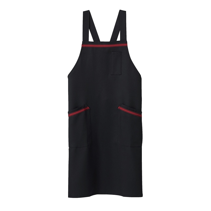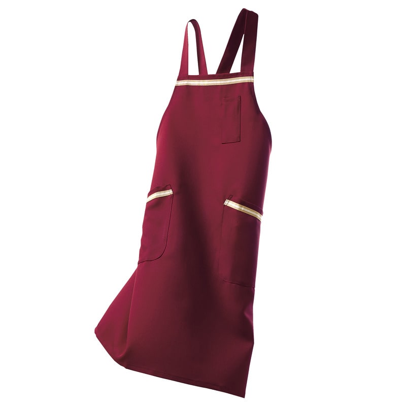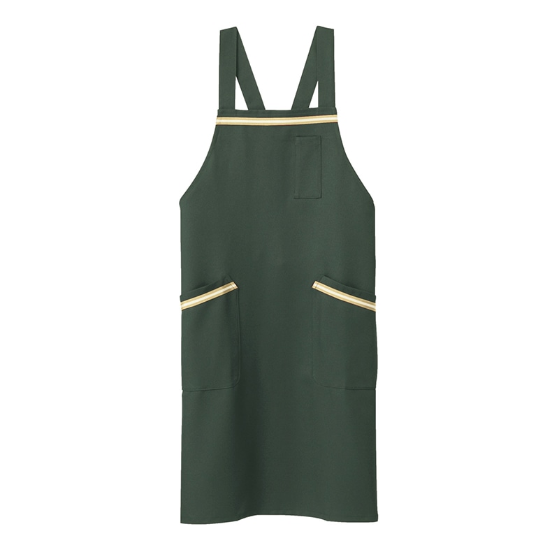 住商モンブランの飲食・カフェ エプロン、防汚・制電機能を付与した男女兼用、胸元に華やかさを添えるアクセントのテープをアレンジしたエプロンです。