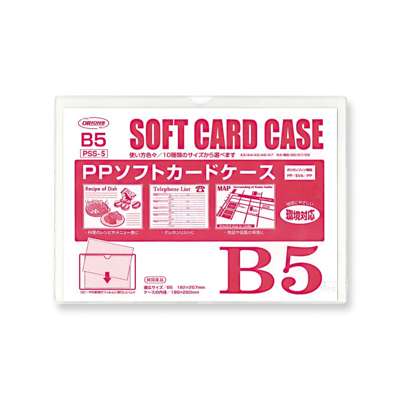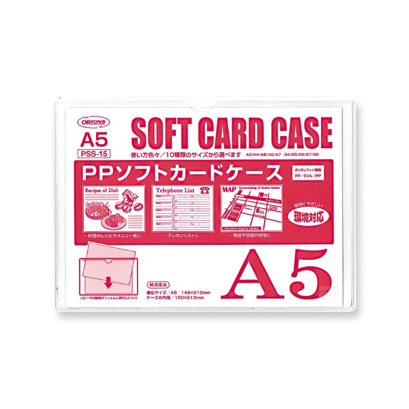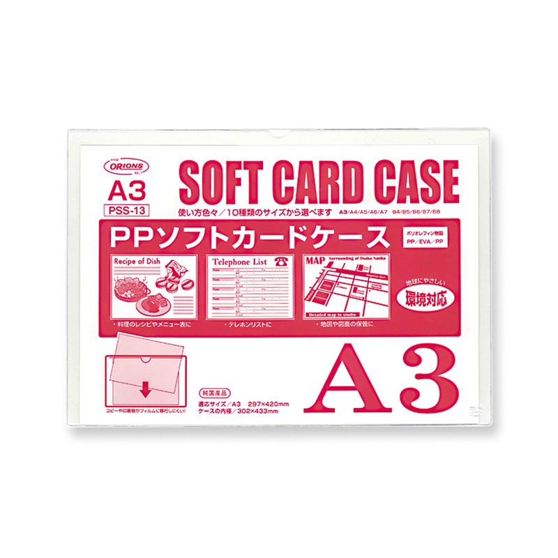 地球にやさしい環境対応ソフトカードケースです。図面や地図、書類の保管、料理のレシピやメニュー表などに役立ちます。原稿・書類を汚さず保管できます。●素材の厚み:0.3mm