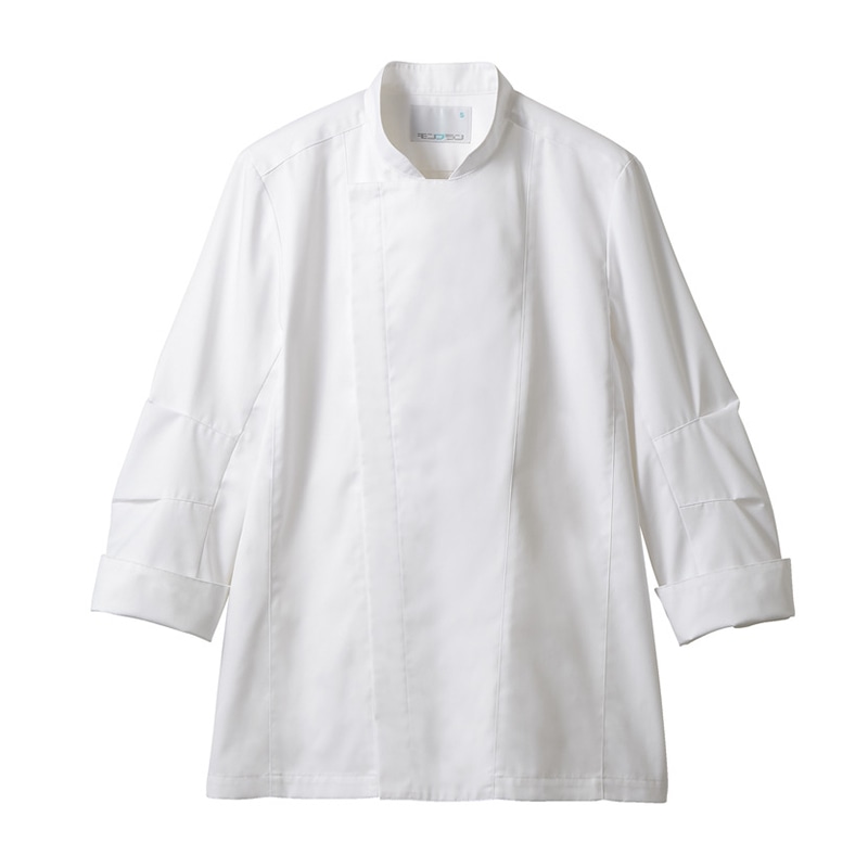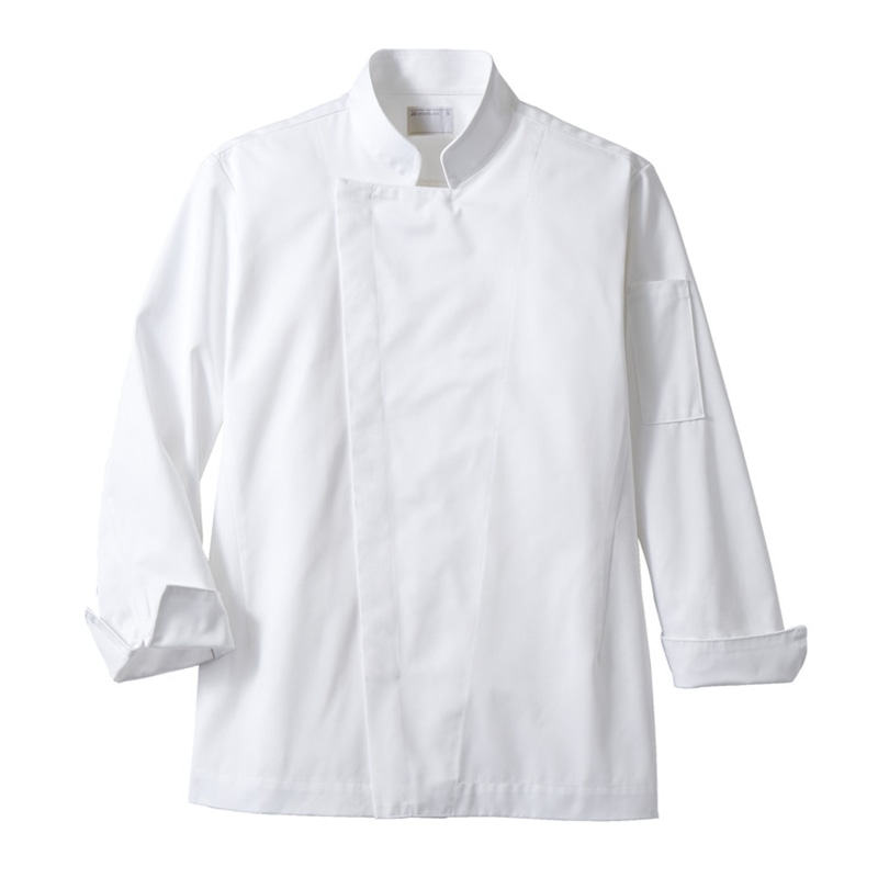 やわらかな着心地の素材を使用した長袖のコックコート。下を向くなどの首の動作によって起こる摩擦を軽減する襟設計。肩や腕の動きをスムーズにする背面アクションプリーツ。メッシュ素材のベンチレーションで通気性を確保。肘の曲げ伸ばしを快適にサポートするエルボータック。強度があり、腐食・変色しにくいステンレス製のスナップボタン。エプロンからの裾の吹き出しを防止する長めの着丈。