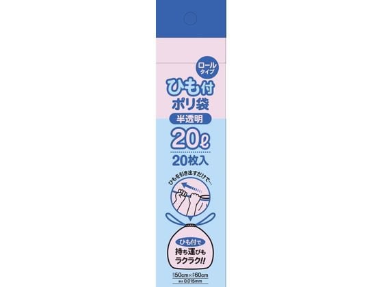 ひも付きロール、ポリ袋。●半透明タイプ。ひも付きで持ち運びラクラク。ロール式でコンパクトに収納。●材質:高密度ポリエチレン●厚み:0.015mm●寸法:650mm×800mm●注文単位:1箱(20枚×30個)※メーカーの都合により、パッケージ・仕様等は予告なく変更になる場合がございます。