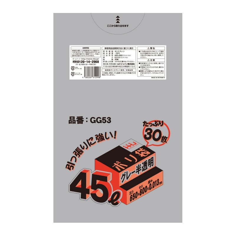 ハウスホールドジャパン ポリ袋 45L GG53 グレー半透明 30枚入 1冊(ご注文単位40冊)【直送品】