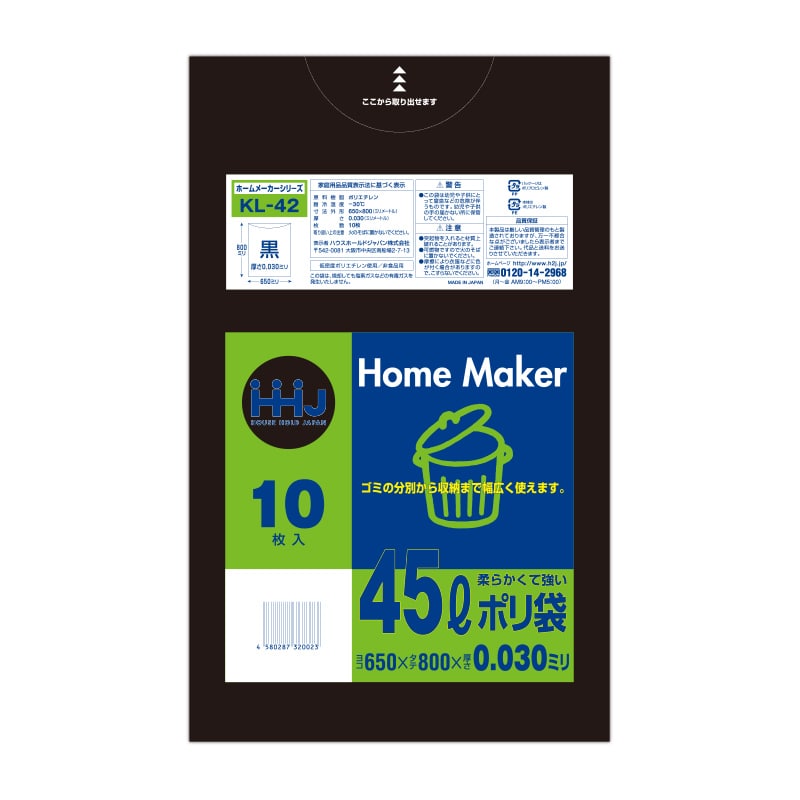ハウスホールドジャパン ポリ袋 45L KL42 黒 10枚入 1束(ご注文単位60束)【直送品】