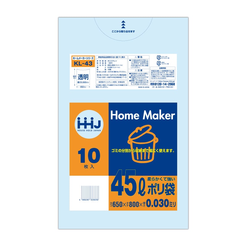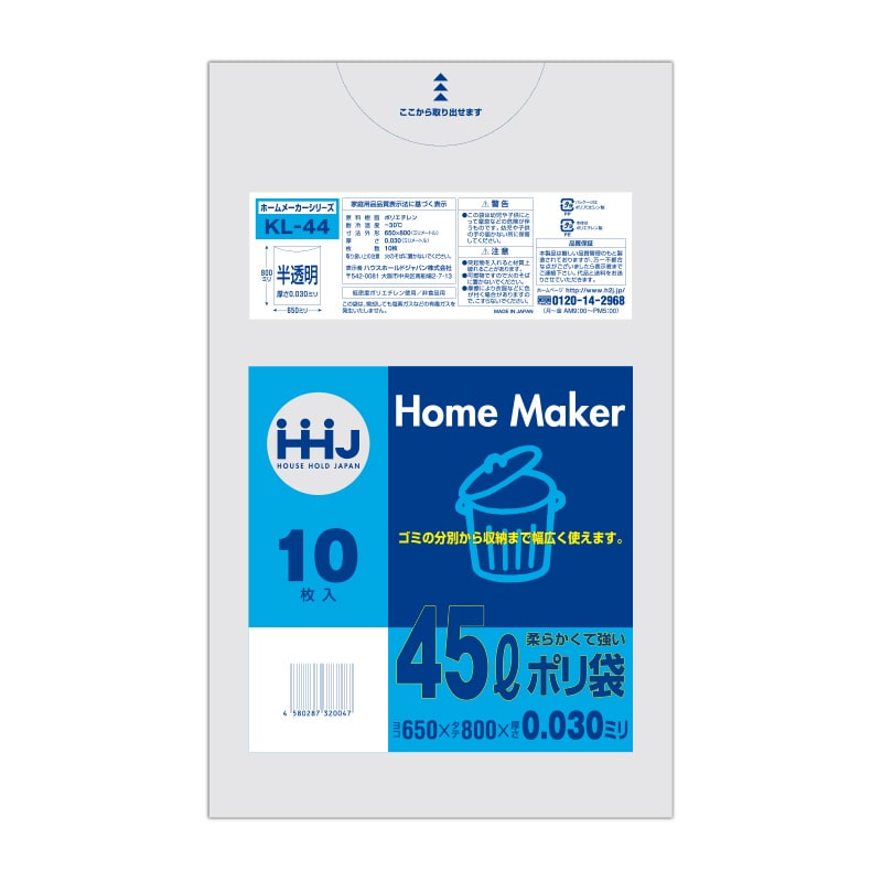 ハウスホールドジャパン ポリ袋 45L KL44 半透明 10枚入 1束(ご注文単位60束)【直送品】